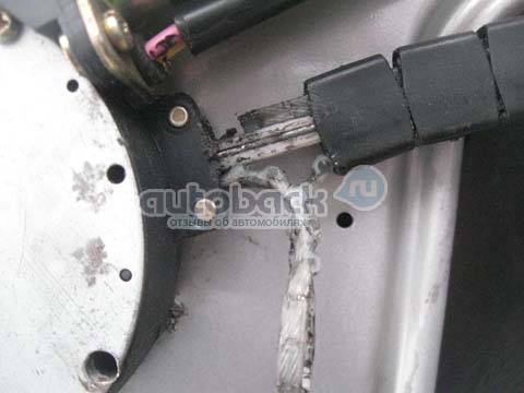 Трос стеклоподъёмника лопнул и завернулся петлёй. Расправляя петлю, плоскогубцами подкрутила механический подъёмник.